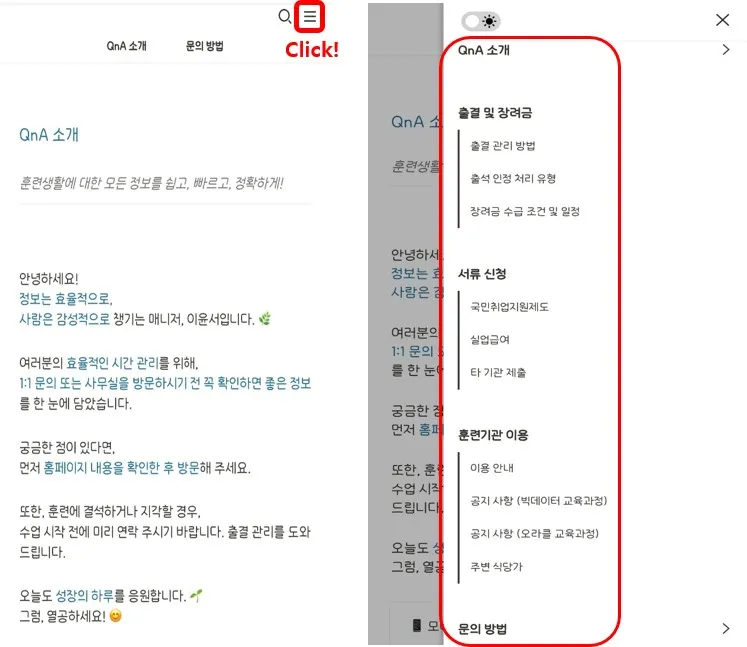 또한, 훈련에 결석하거나 지각할 경우, 수업 시작 전에 미리 연락 주시기 바랍니다. 출결 관리를 도와드립니다.
